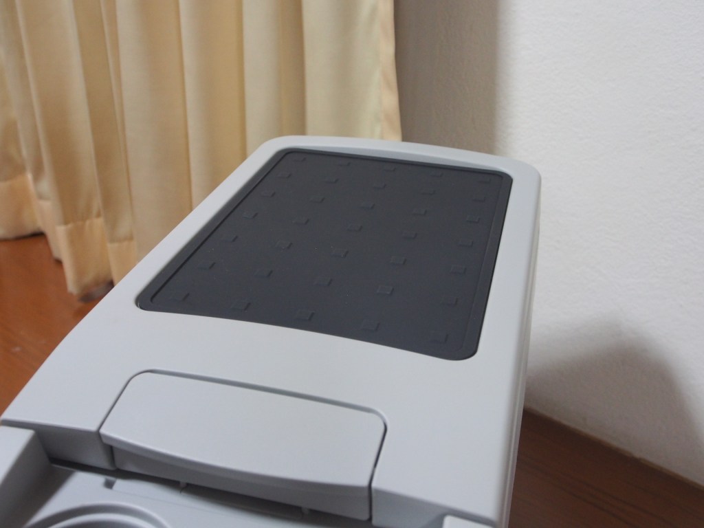 ด้านบนเป็นแถบยางกันลื่น มีปุ่มสี่เหลี่ยมกันลื่นหลายปุ่มยื่นขึ้นมา เนื้อสัมผัสยางดีมาก วัสดุดีเยี่ยม เอาแขนวางแล้วฟิน~ สามารถวางของบนนี้แล้วของไม่กลิ้งหล่นไปง่าย ๆ (แต่ถ้าเบรคแรงของพุ่งแน่นอน) สำหรับต่างประเทศ บางคนถึงขั้นแต่งคอนโซลที่พักแขนรถใหม่สำหรับรถที่มีบริเวณที่วางแขนค่อนข้างกว้างเช่นรถตู้ ให้สามารถวางตู้เย็นลงไปแทน เพื่อประหยัดพื้นที่ในการใช้งาน แล้วก็สวยไปอีกแบบ
