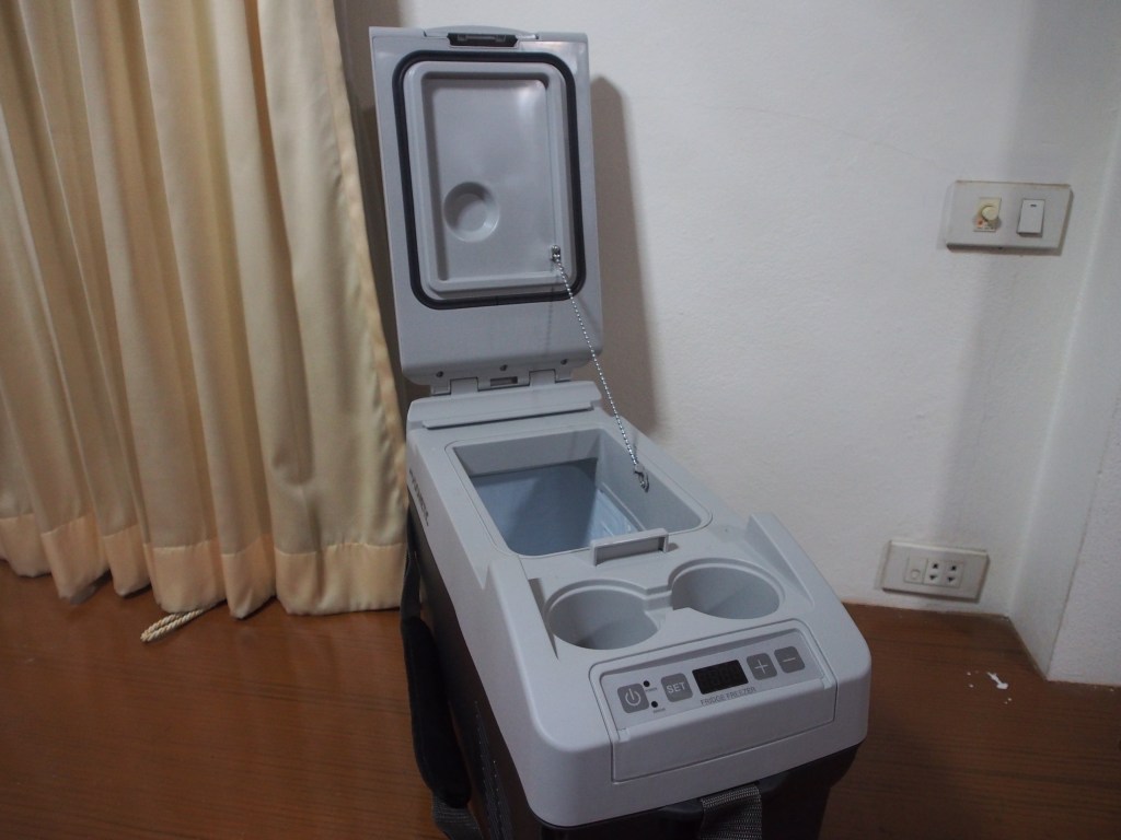 ผมเปิดตู้เย็นทิ้งไว้ให้ทำความเย็นตลอดทั้งคืนก่อนการเดินทาง ตื่นเช้ามายกตู้ไปติดตั้งในรถ เมื่อเสียบปลั๊กกับที่จุดบุหรี่ไฟทำงานติดทันที ไม่ต้องเสียเวลามานั่งกดปุ่มเปิด