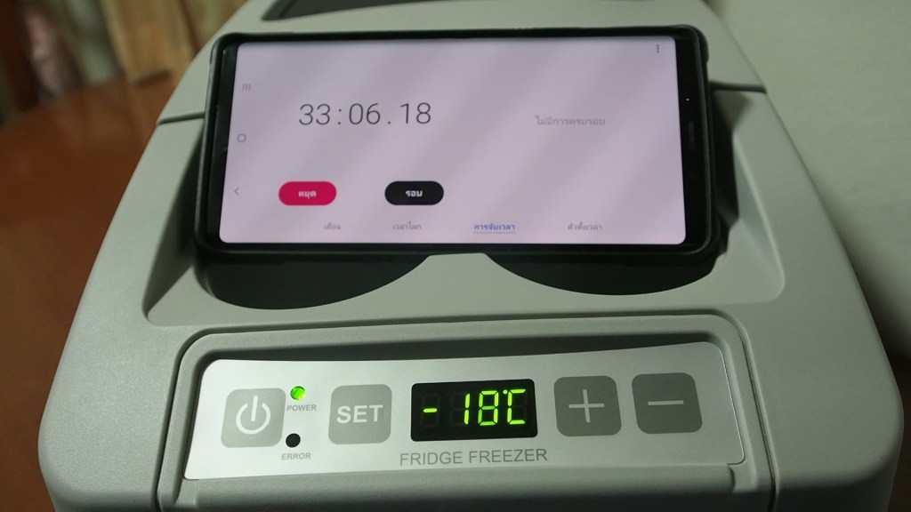 ผมทดสอบจากตู้ซึ่งตั้งไว้ที่ 0 องศา ให้ทำอุณหภูมิไปที่ – 18 องศา โดยไม่บรรจุสิ่งของภายในตู้ จากภาพอาจจะดูเหมือนว่าเริ่มจาก -1 องศา แต่จริง ๆ แล้วเริ่มจาก 0 นะครับ เมื่อตั้งอุณหภูมิเสร็จอุณหภูมิเลยเริ่มเปลี่ยนแปลงทันที