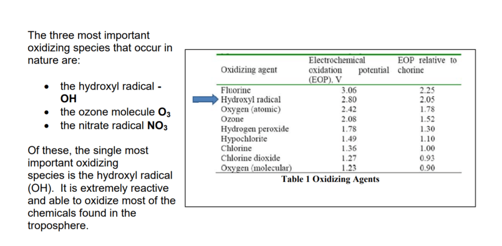 ขอเกริ่นด้วยตารางเปรียบเทียบประสิทธิภาพในการทำปฏิกิริยา จากตารางจะเห็นได้ว่าประจุไฮดรอกซิล (OH-) มีประสิทธิภาพสูงกว่า Ozone , Hydrogen peroxide (น้ำยาฆ่าเชื้อในห้องผ่าตัด) และ คลอรีน ซึ่งสารเหล่านี้คือสารที่มีความสามารถในการฆ่าเชื้อโรคด้วยการทำปฏิกิริยาที่ผนังเซลล์ของเชื้อโรค