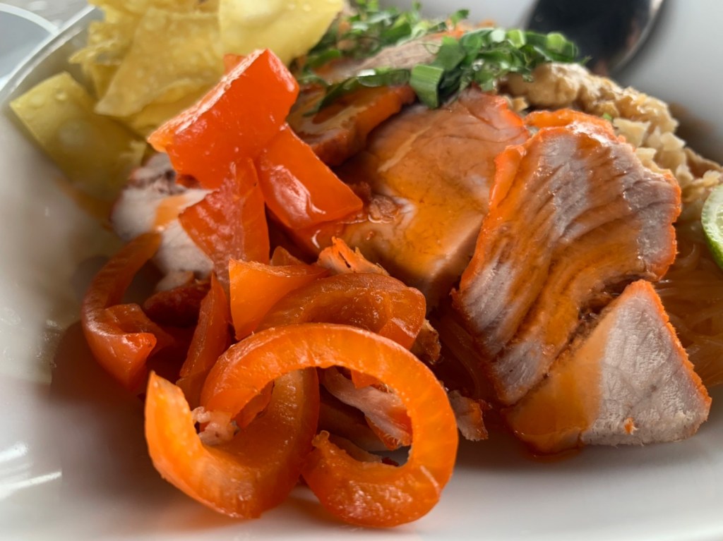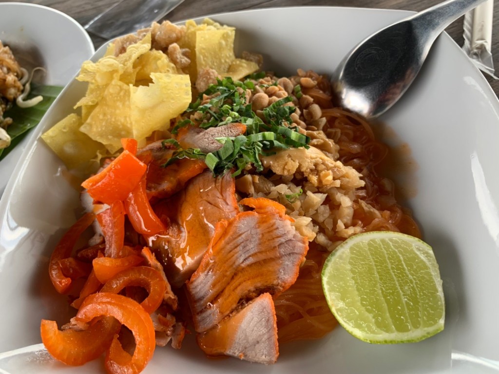ผัดไทโบราณเส้นจันท์หมูแดง เมนูนี้เป็นของพ่อตา แกก็บอกว่าอร่อย ซึ่งจริง ๆ เมนูนี้จะต้องมีหนังหมูด้วย แต่พ่อตาไม่ทานครับ